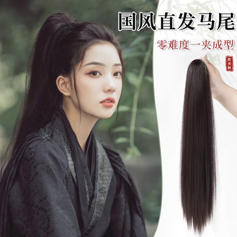 高馬尾かつら古風漢服長髪お下げ古風侠客男女共通シミュレーション黒髪ストレート馬尾