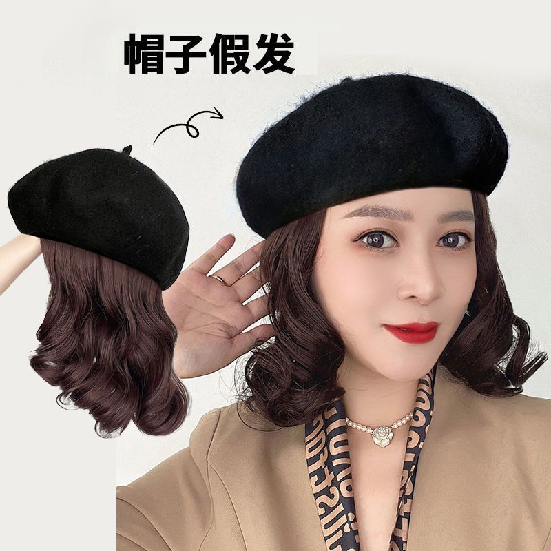 帽子のかつらの一体のベレー帽の女性の短い巻き髪の秋冬のネットの赤い同項の百合の顔の小さい八角の帽子のかつらの帽子