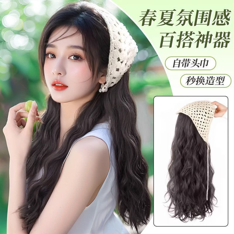 三角スカーフ水波紋長巻き髪全頭カバー軽薄通気田園風一体模擬髪半頭カバー
