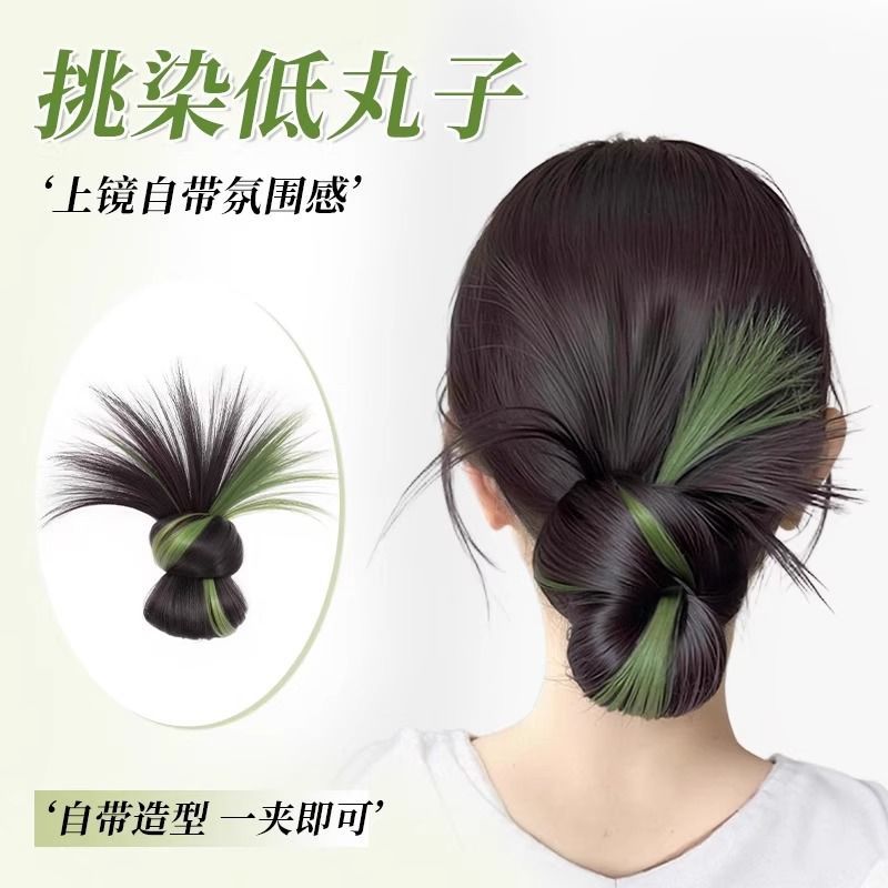 鶏の毛を染めて低い団子の頭のかつらを刺してシミュレーションします。