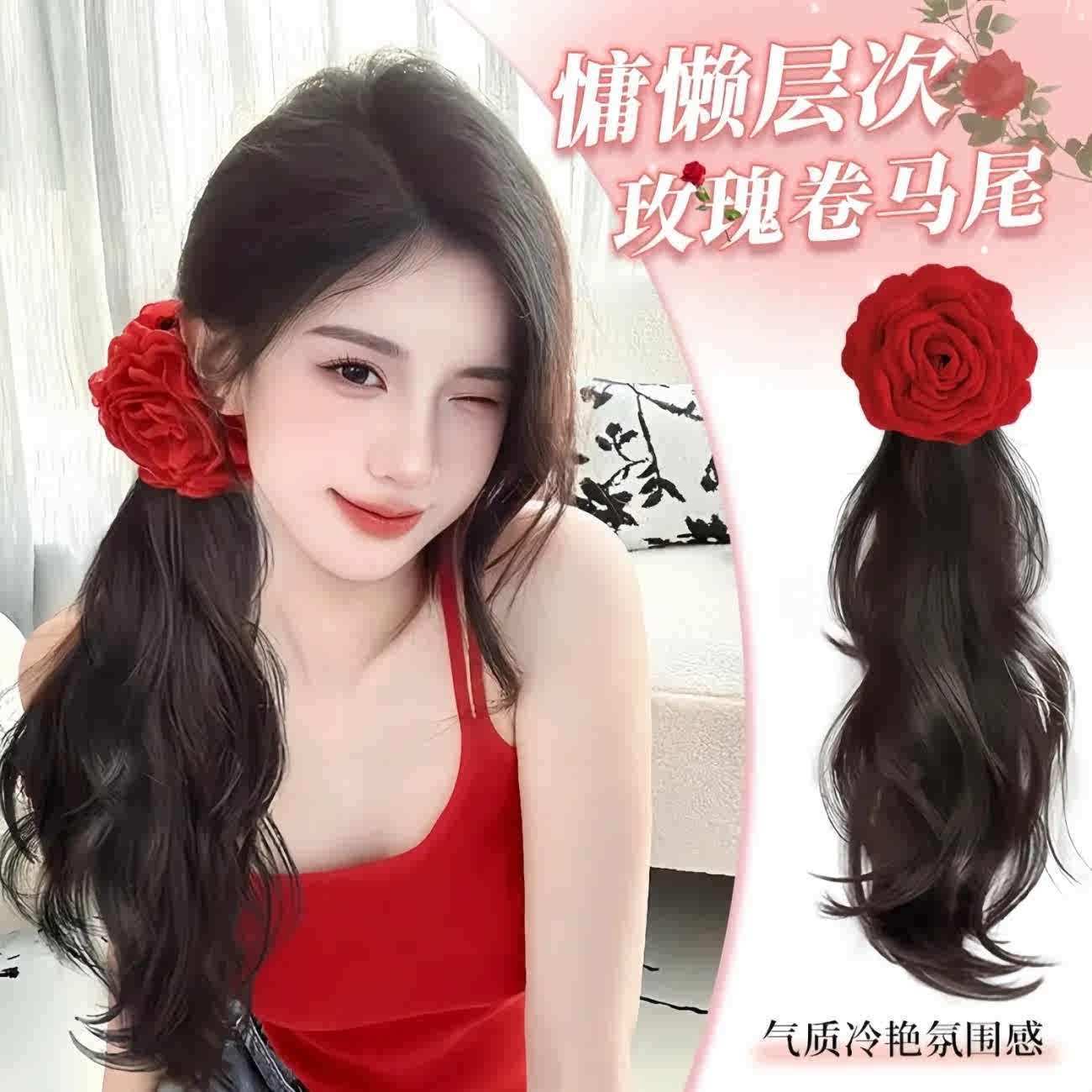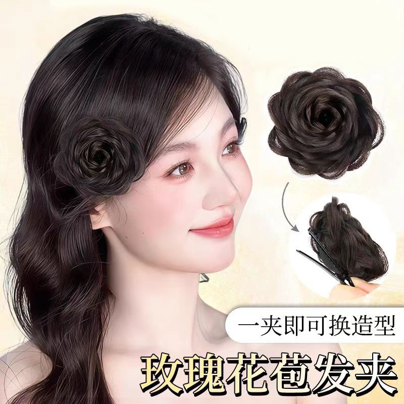 ローズボールヘッドウィッグ、女性用韓国風フラワーヘアクリップ、雰囲気のあるサイドナチュラルスタイルヘアアクセサリー、ヘアバッグ