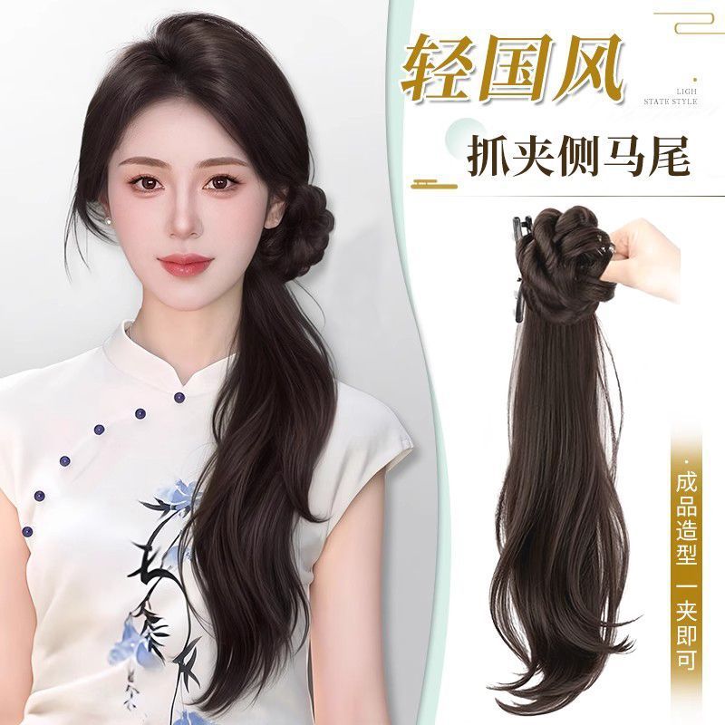新しい中国風の女性用ウィッグ、中国風の漢服クリップ、サイドポニーテール、古代風のウィッグ、三つ編み、人工毛のチャイナドレス、少しカールしたポニーテール