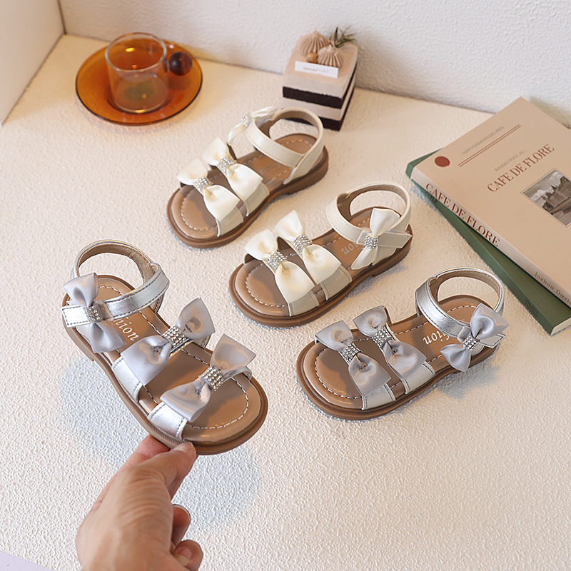 ガールズファッションデザインリボンプリンセスサンダル 2025 夏の新しい子供のソフトソールオープントゥビーチシューズ