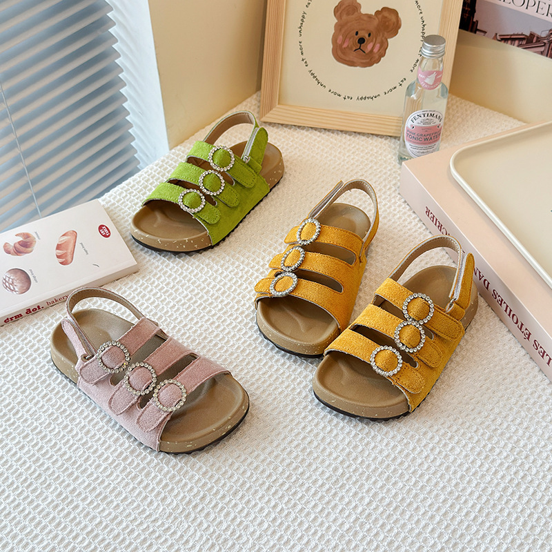 子供の厚底ビルケンシュトックサンダル 2025 夏の新韓国スタイル女の子ラインストーンラウンドバックルプリンセスシューズオープントゥビーチシューズ