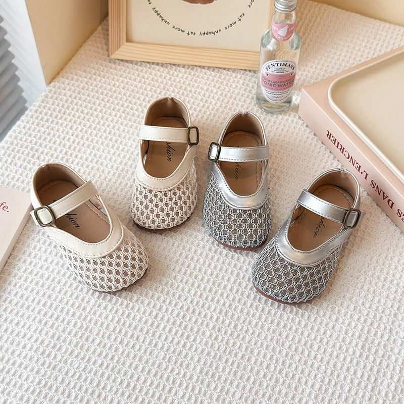 女の子用の小さな革靴、中空プリンセスシューズ、通気性のある子供靴、2025夏の新しいソフトソールカジュアルシューズ、ビーニーシューズ、トレンディ