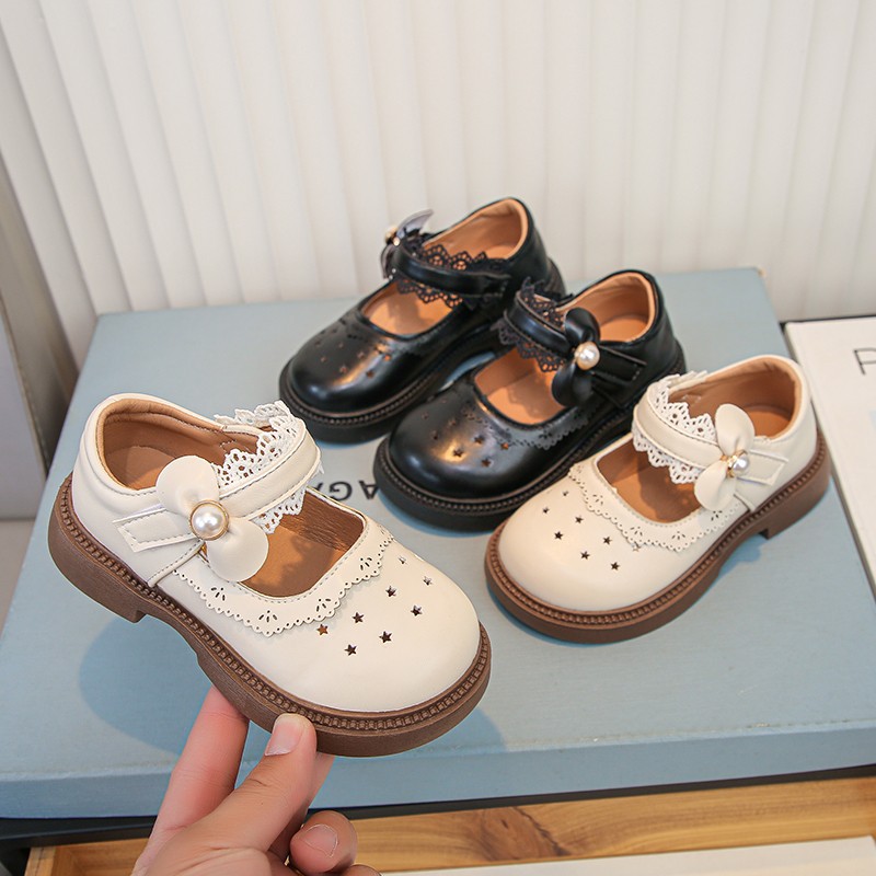女の子の革靴 2025 春と秋の新しい子供のプリンセスシューズ子供の弓パール小さな革靴ソフトソールベビーシューズ