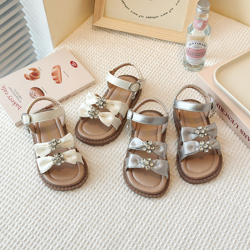 女の子の靴 2025 夏の新スタイルラインストーンリボン西洋スタイルプリンセスシューズ韓国スタイル多用途ソフトソールビーチシューズ