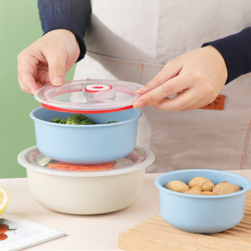 小麦わら大中小鮮度保持箱3点セット蓋付き密封収納箱携帯プラスチック鮮度保持碗セット