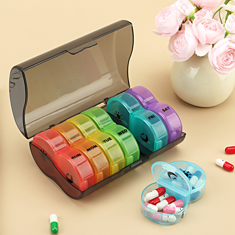ポータブル携帯7格虹バウンスボタン薬箱7日間七彩旅行分格錠剤収納箱