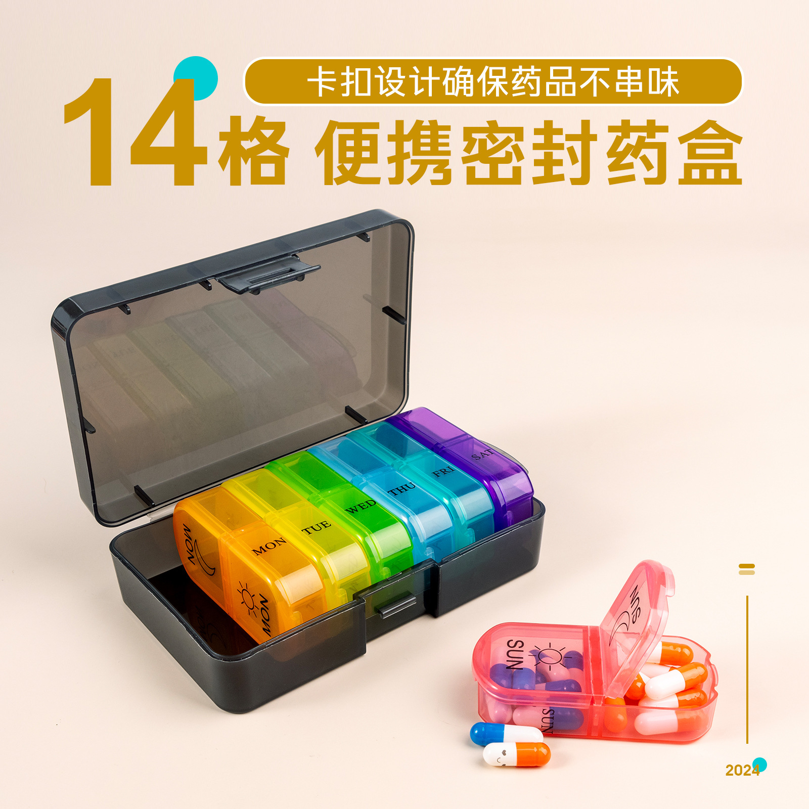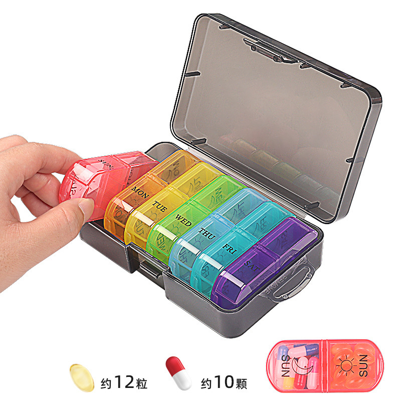 携帯7日間密封薬箱大容量錠剤分注箱旅行プラスチック分格14格小薬箱収納箱