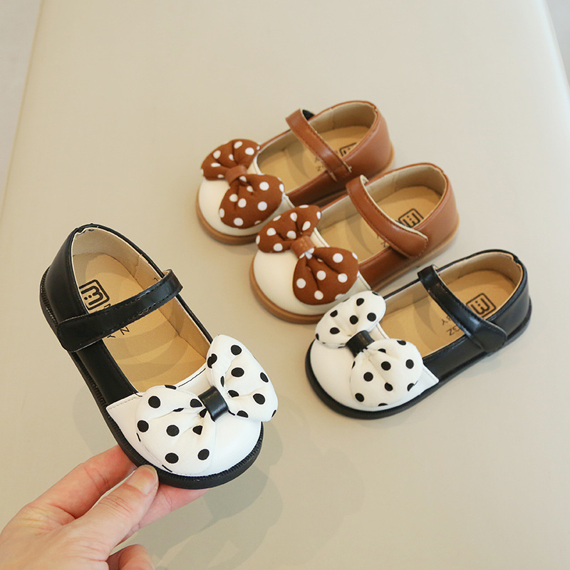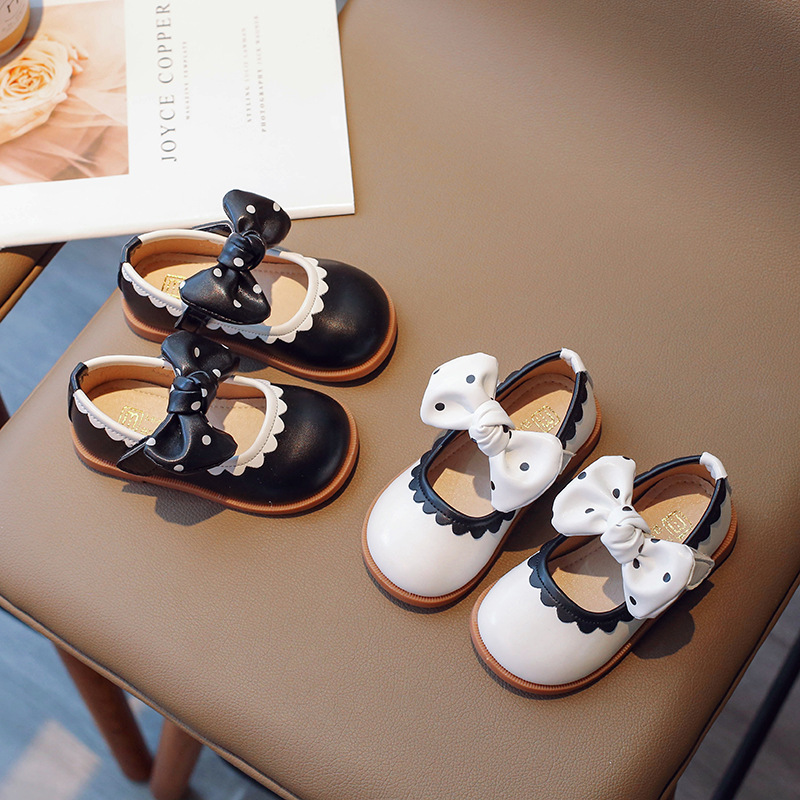 2025春の新型韓国の女の子の靴のファッションは子供の波点の蝶結びの靴の柔らかい底の王女の靴を合わせます。