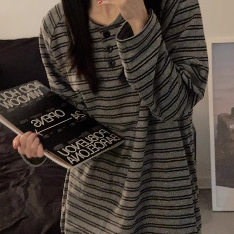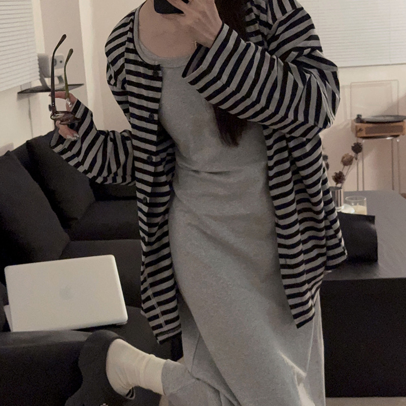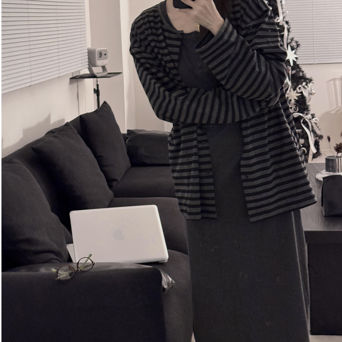 2025春の新型韓国風ストライプカーディガン純綿スカート人綿中長タイプカジュアルワンピース2点セット外