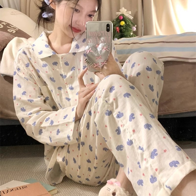 2025新型の春は韓国版の上質な二重綿ガーゼの甘いカジュアルなパジャマの女性の家の服を寝ます。