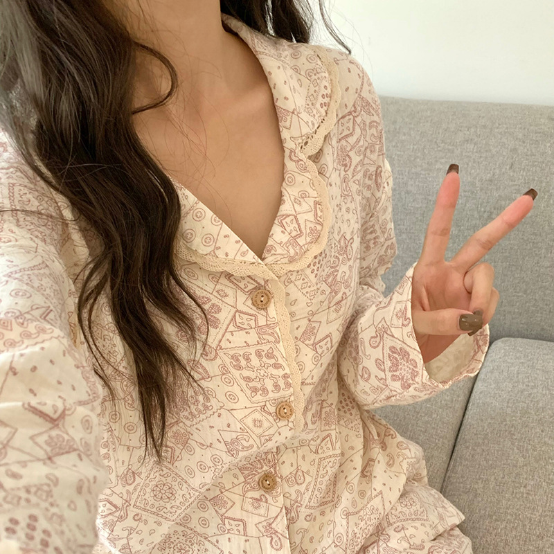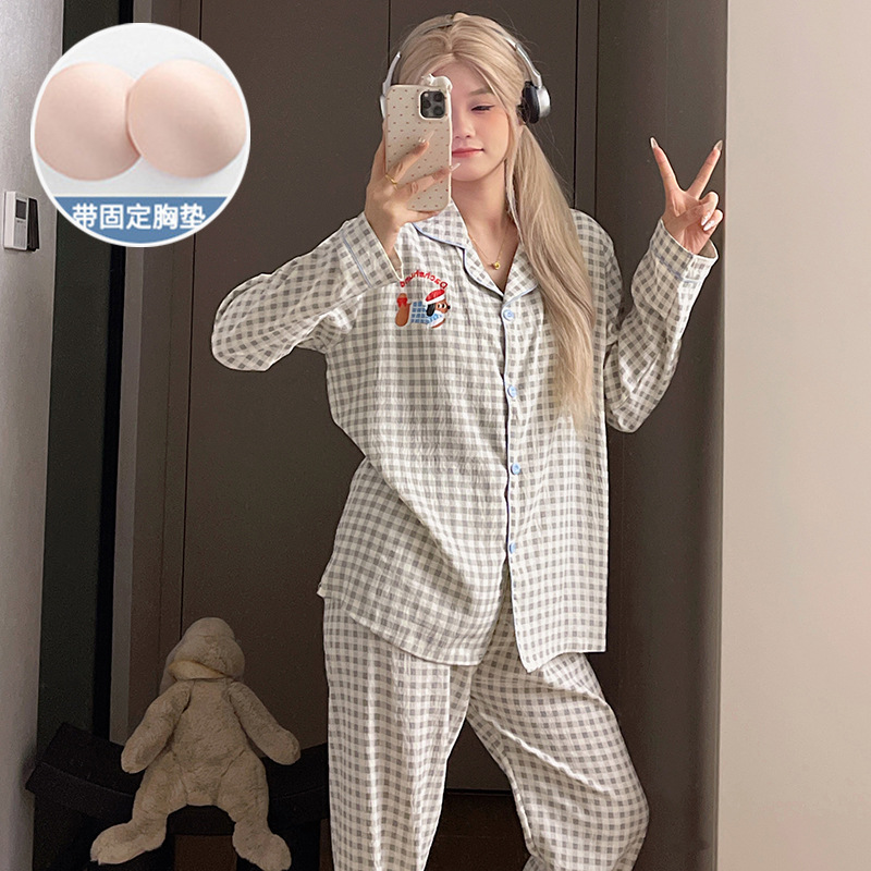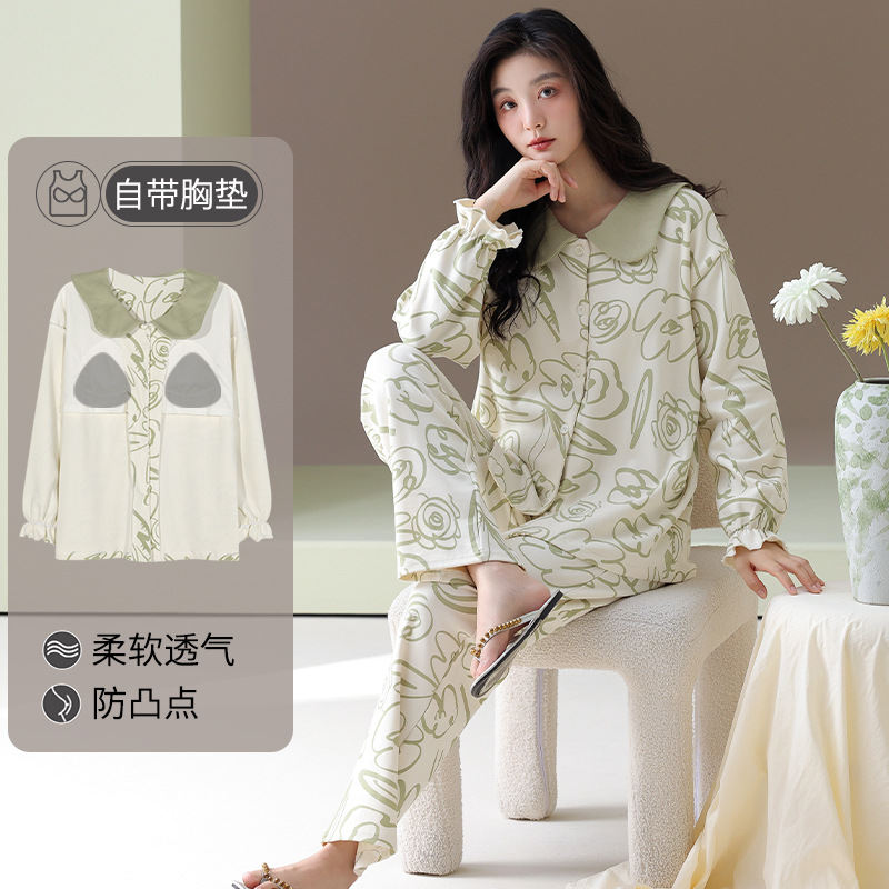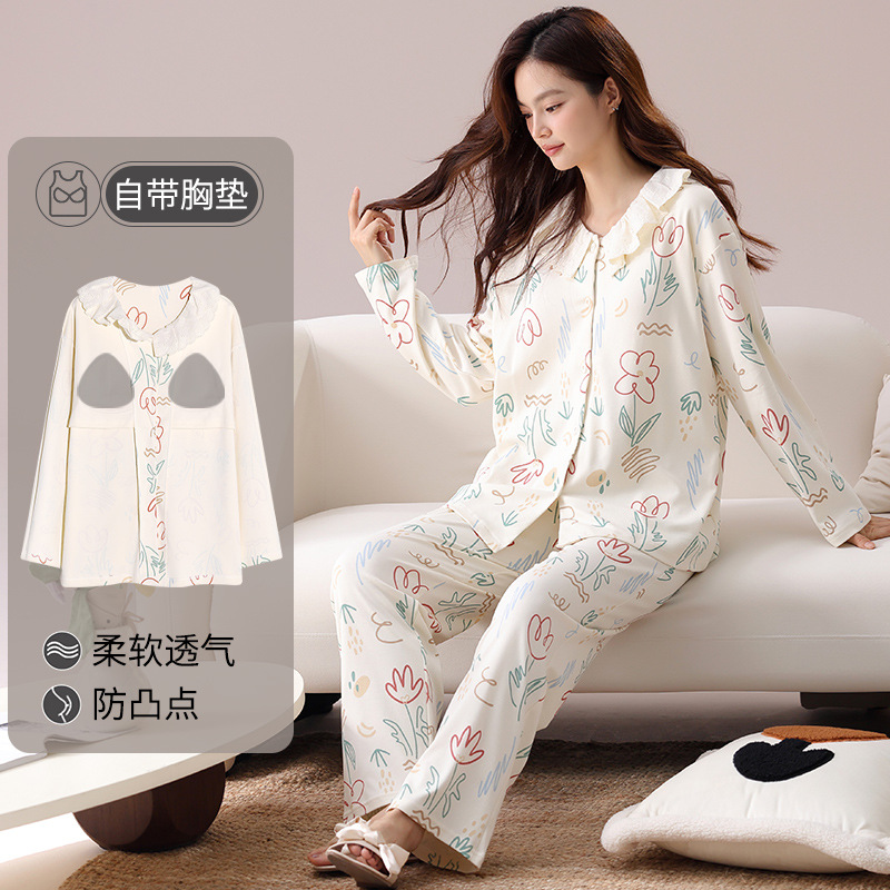 2025春の新型韓国版パジャマ女性用胸パッド付きシャトル織り雲綿カーディガン甘い長袖ホームウェアセット