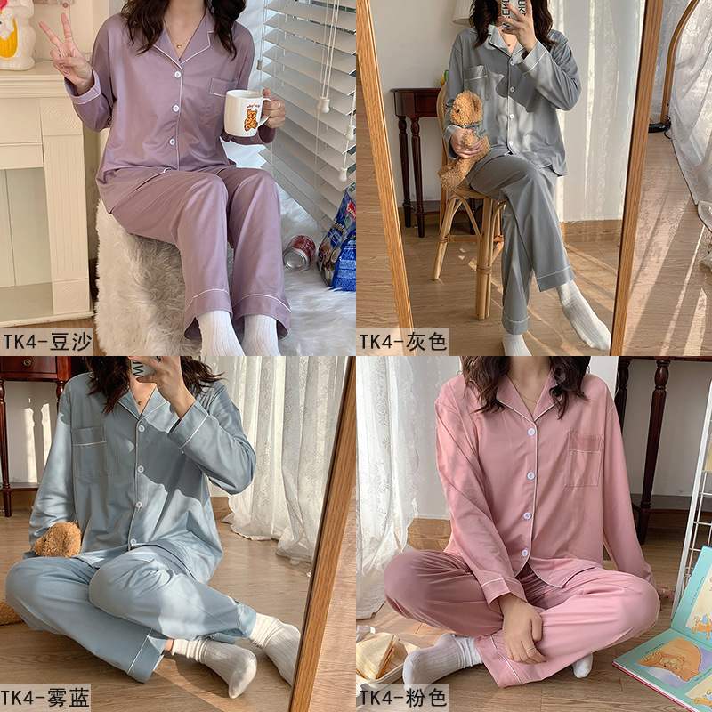 2025春の新型氷雪シルクのシンプルなパジャマ女性長袖の薄いカーディガンの襟付きシルクの家庭服セット
