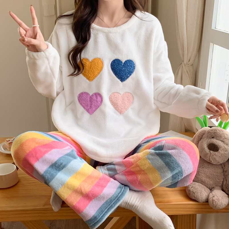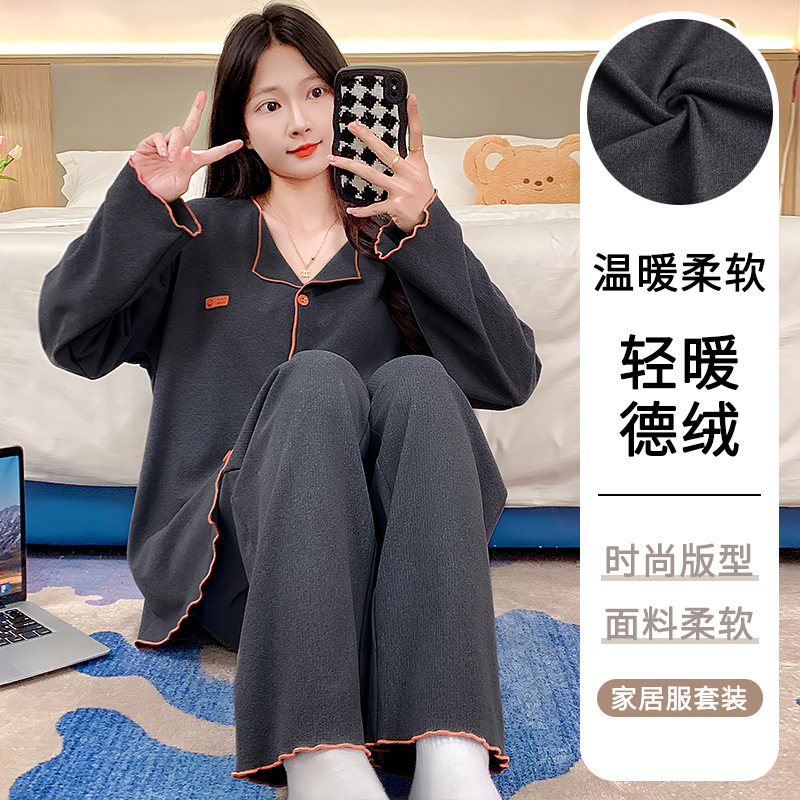 2024新型フランネルパジャマ女性秋冬ベルベットは甘い丸首を厚くして家庭服セットを着ることができる