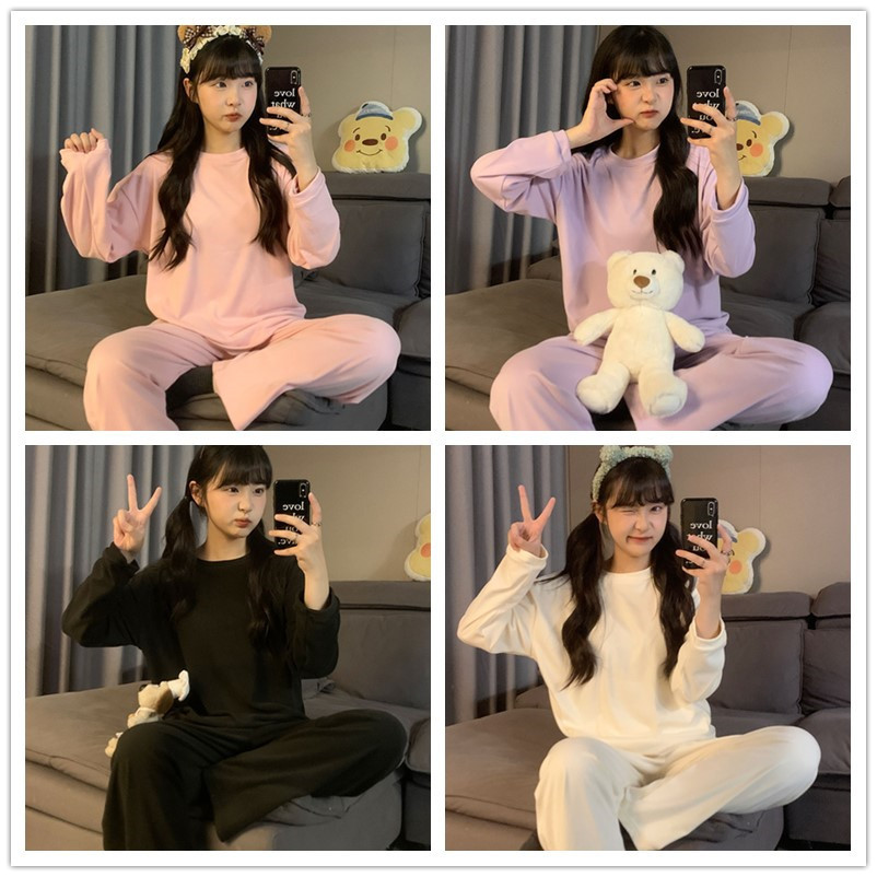 2024新作秋のデコルテ純色丸首長袖長ズボンパジャマ女性服セットカジュアルホームウェア外着