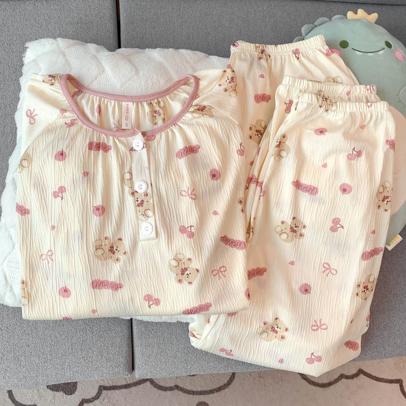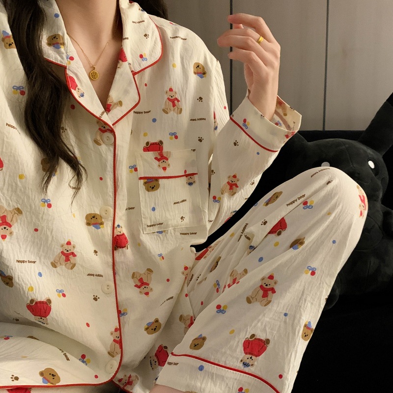 【雲綿】日本の波点熊の大きいサイズのパジャマの女性春と秋の長袖のズボンの少女の家の2つの服