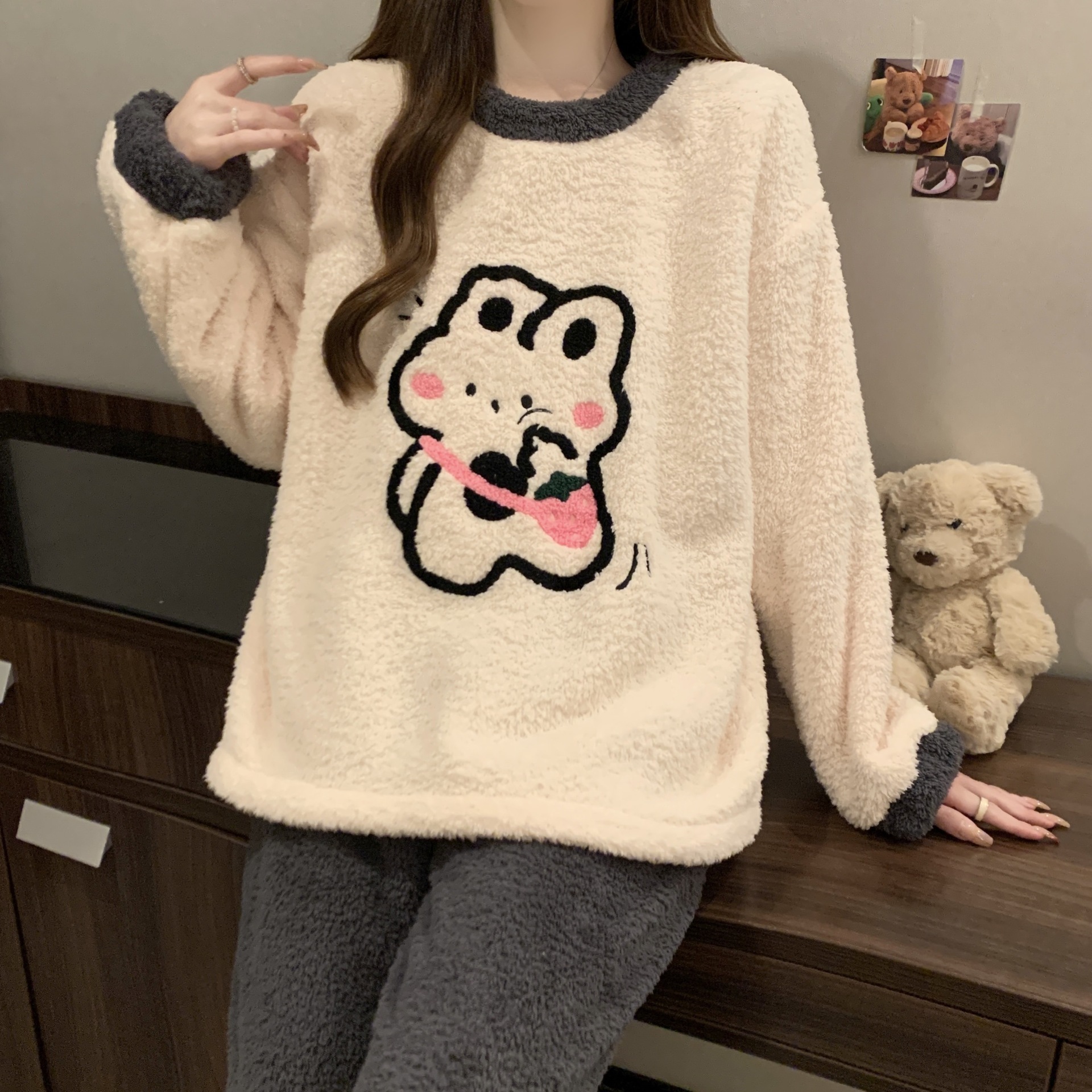2024冬の新型ベアーの柔らかいモチモチのパジャマの女性の半分の絨毛の漫画のかわいい丸首のレジャーの部屋の服のスーツ