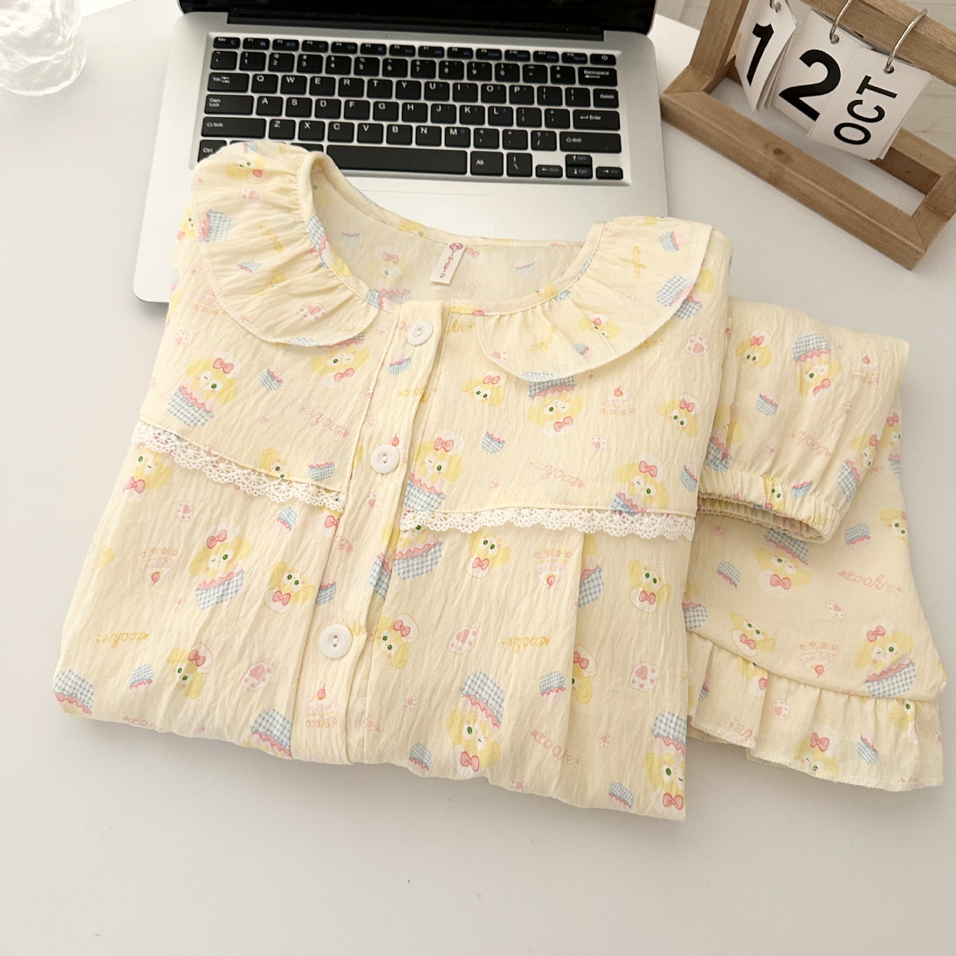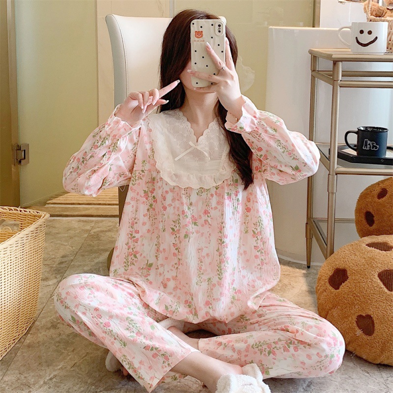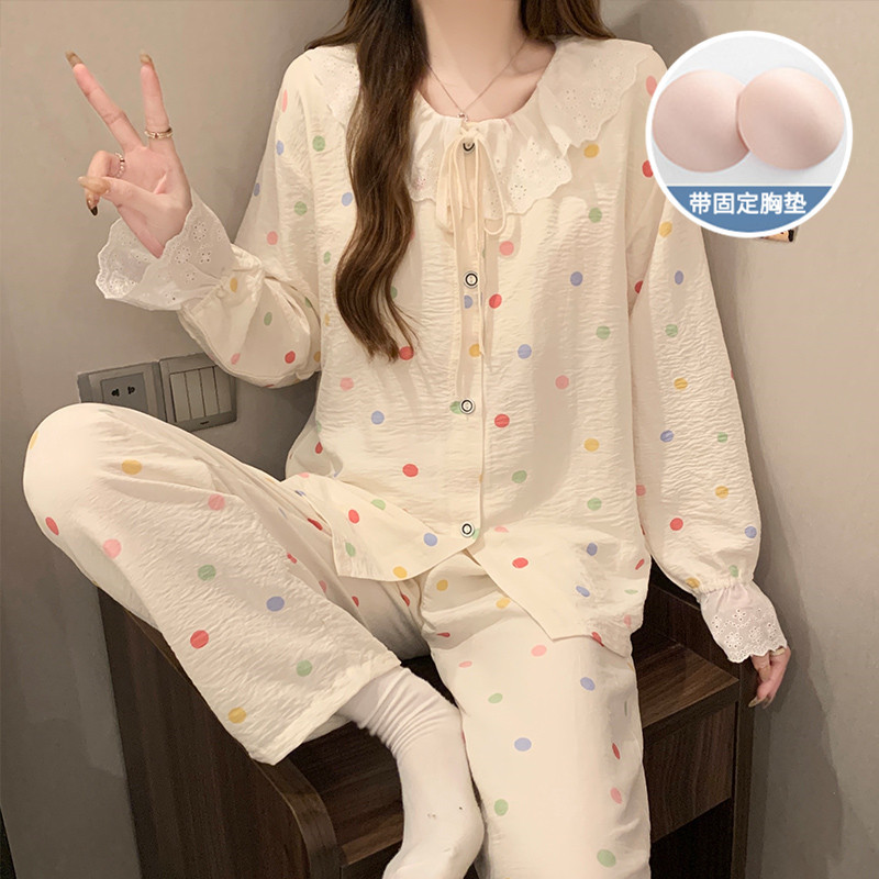 2025韓国の春の新しいパジャマの女性は胸のパッドを持って雲の綿の長袖の甘い王女の風の家の服のスーツを編みます。