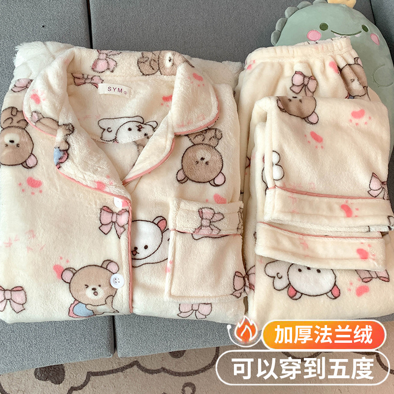 2024冬の新型韓国版パジャマ女性は、半端のベルベットアニメのかわいい丸首カジュアルな家庭服セットを厚くした