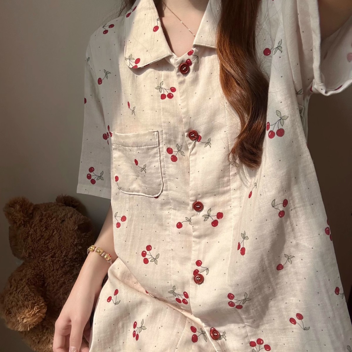 2025 夏の新韓国スタイルインターネットセレブスタイル韓国スタイル ins 甘い模造綿チェリースーツパジャマ女性のホーム服