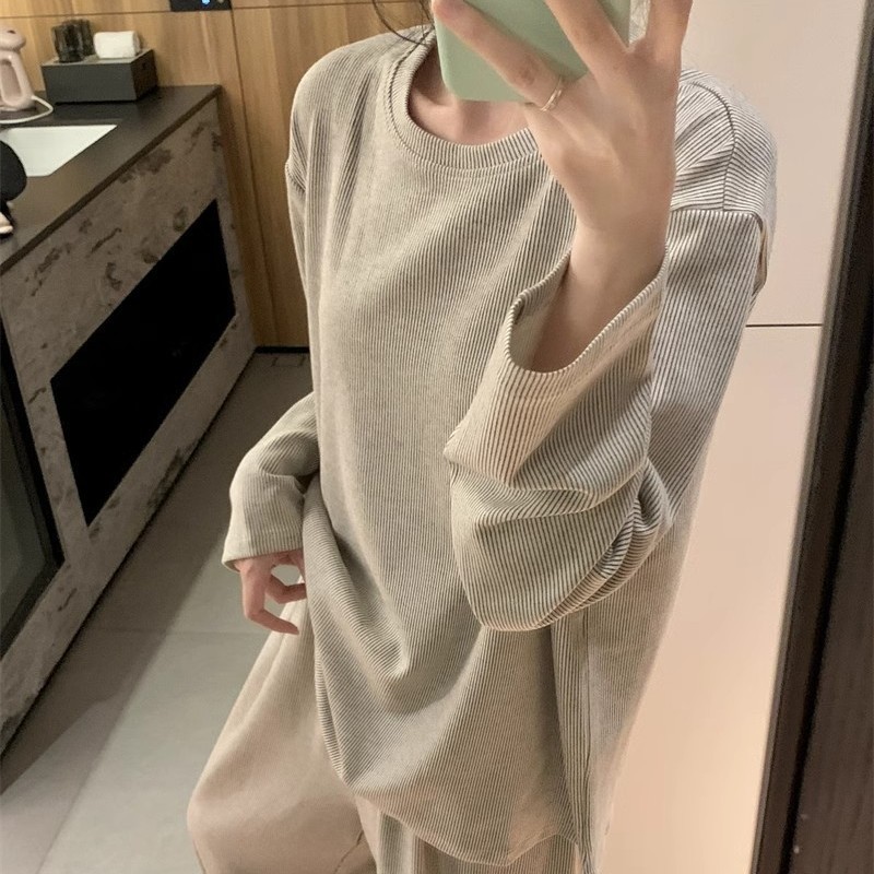 2025年春秋の新型パジャマ女性ネット赤ins風韓国版グレー茶色の縞模様の家庭服セットの外着