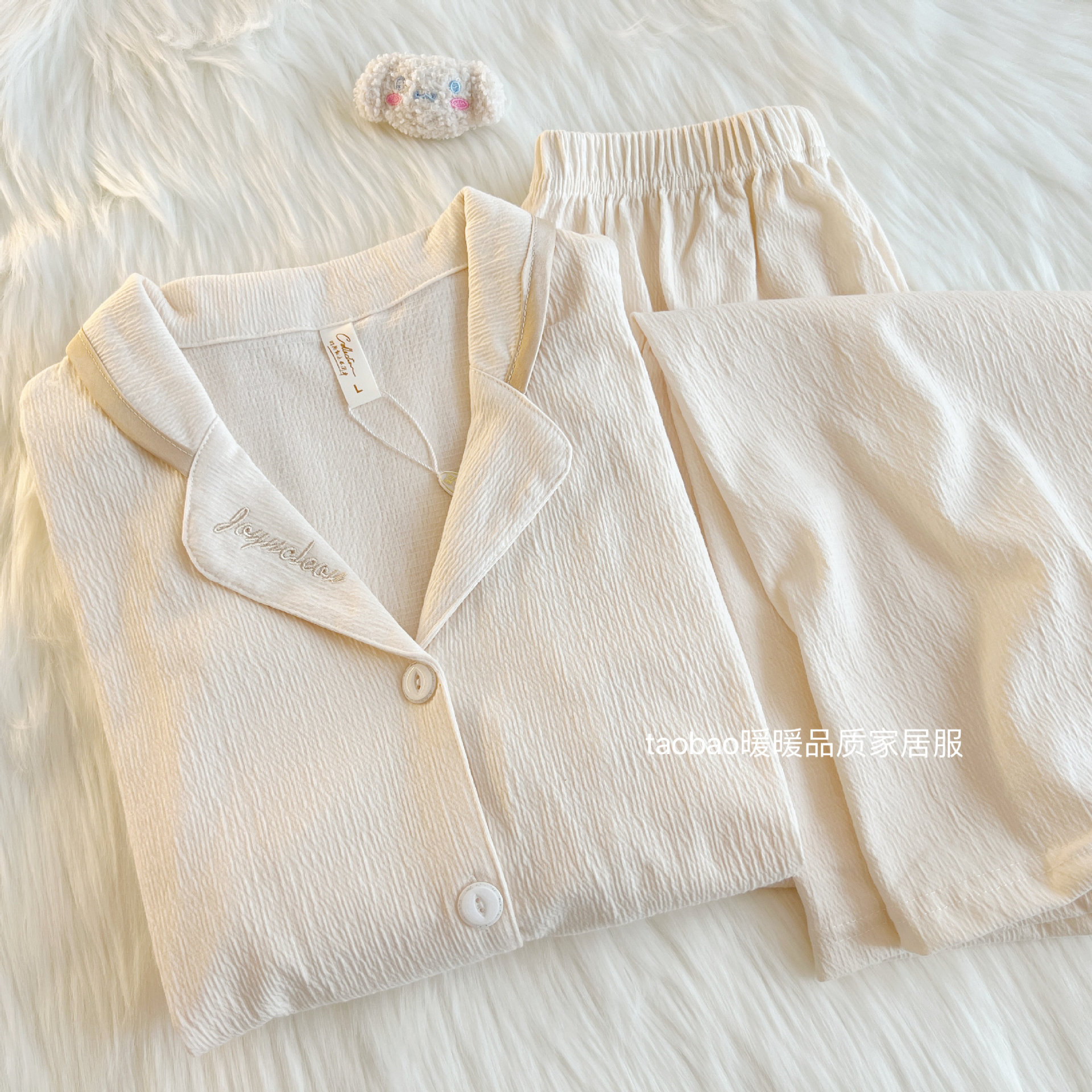 高級感純色純綿長袖パジャマ女性春秋気質金夏女性綿家庭服二点セット