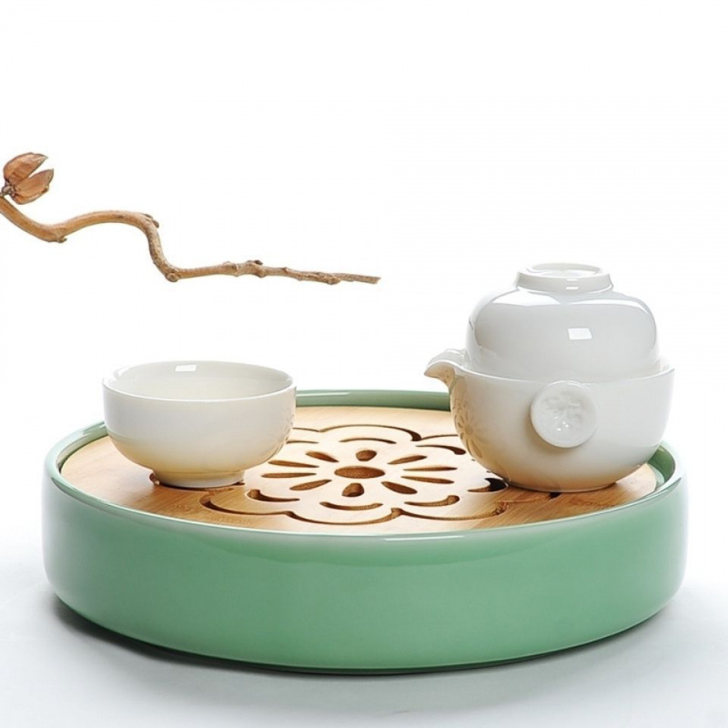 竹セラミックミニラウンドティートレイクイックカップ水貯蔵トレイポータブルティーシートレイドライバブルテーブル青磁ティートレイ