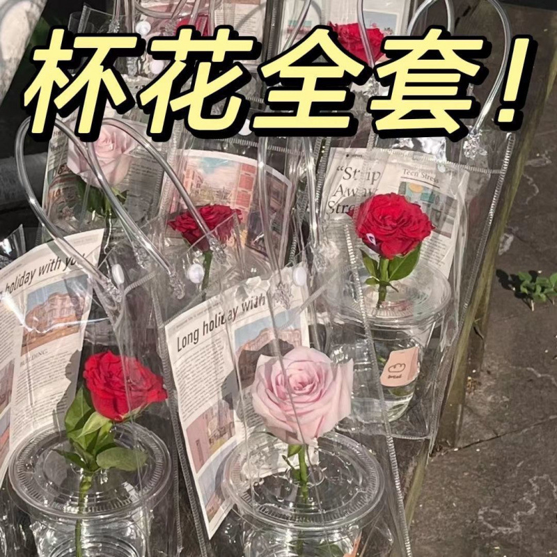 使い捨てネット赤生花生け花カップpvc手提げ袋ins風地露店コーヒーミルクティー創意プラスチック透明カップ