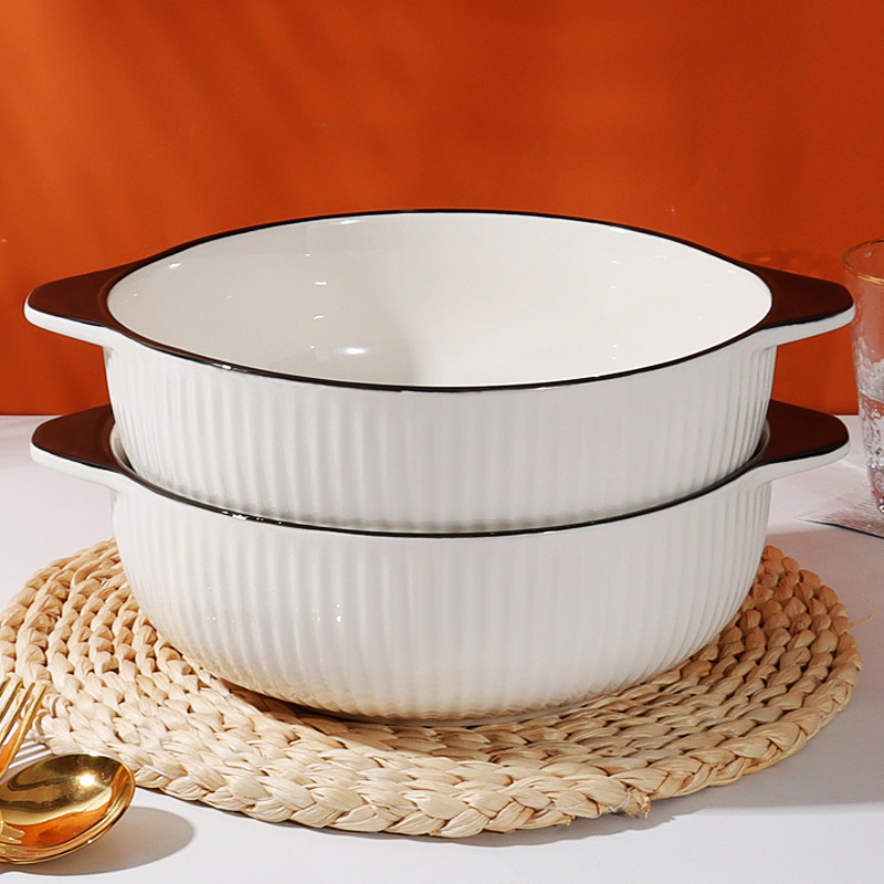 10インチの両耳の縦紋の大きいスープの碗のアイデアの日本式のシンプルな風格の大きいスープの鉢の大容量は陶磁器の家庭用を厚くします。