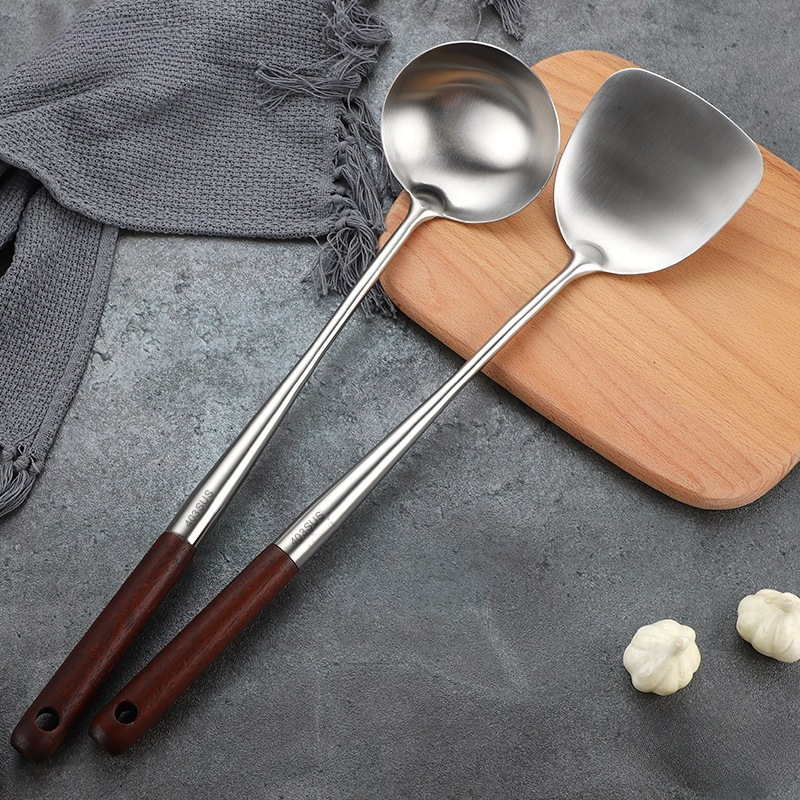 304 ステンレス鋼のクッキングスプーンシェフの特別なクッキングスプーン家庭用厚みのあるスパチュラセット木製ハンドルスープスプーンポットスプーン
