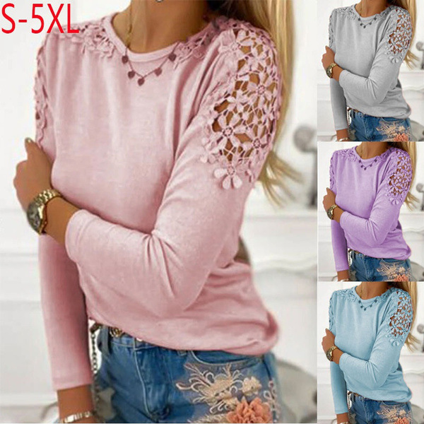 ヨーロッパとアメリカの国境を越えた 2024 秋の新アマゾン AliExpress ソリッドカラースリムレース中空長袖 T シャツ在庫あり