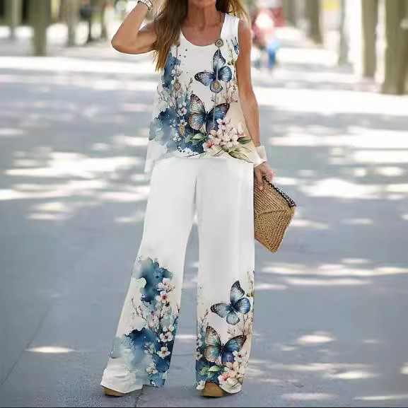 2024対外貿易春夏新アマゾンTEMU独立駅丸襟カジュアルプリントベストワイドパンツセット