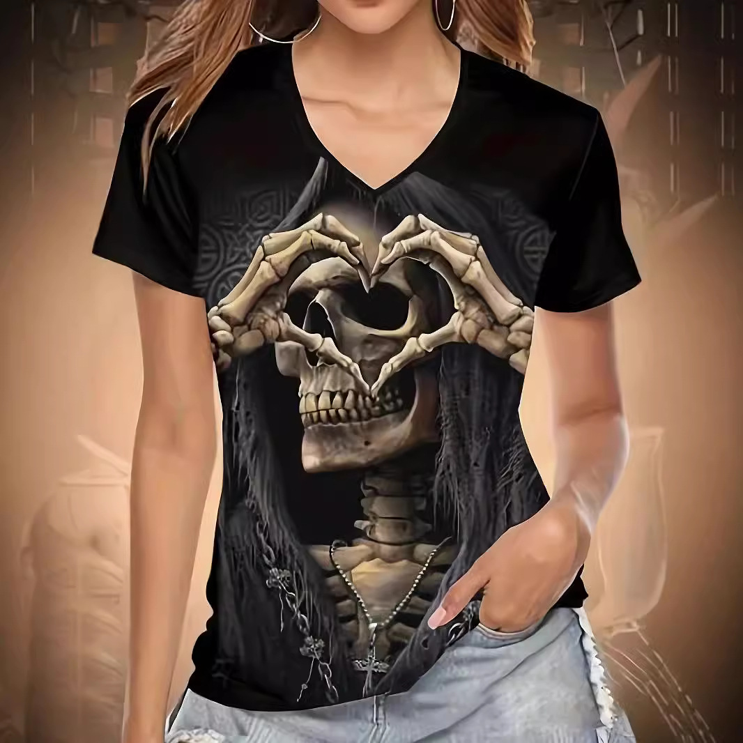 2024外国貿易クロスボーダーtemuアマゾン熱売夏女装スカルプリントvネック半袖tシャツ女1890