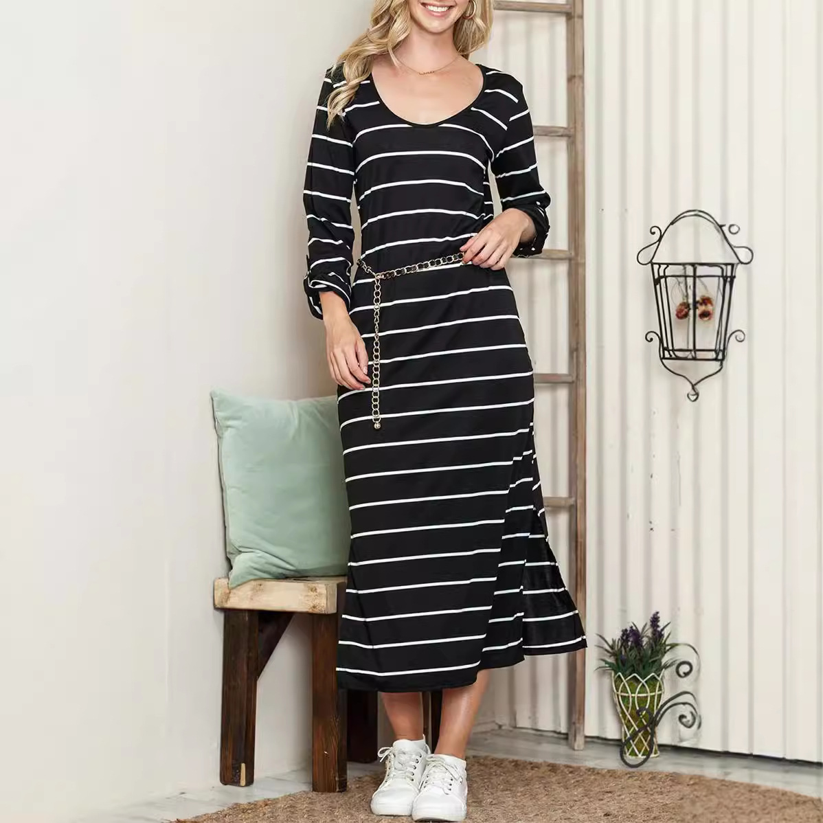 2024欧米ファッション秋の新型長袖ストライププリントにカジュアルなワンピースBB0333