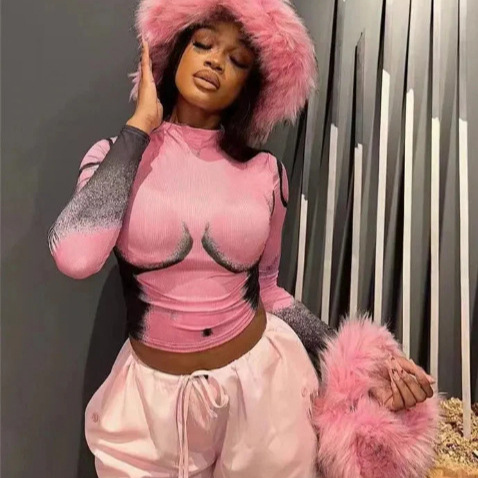 欧米の婦人服の2024秋冬の新型のファッション性のセクシーなカジュアルな臍の短いタイプの修身の丸首の長袖の上着の女性