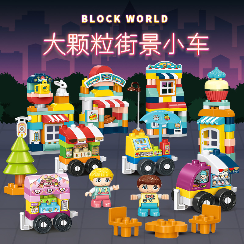 大粒の百変の交通の車は積み木の子供の益智の美食の軽食を詰めて屋台の街並みを並べておもちゃを挿します。