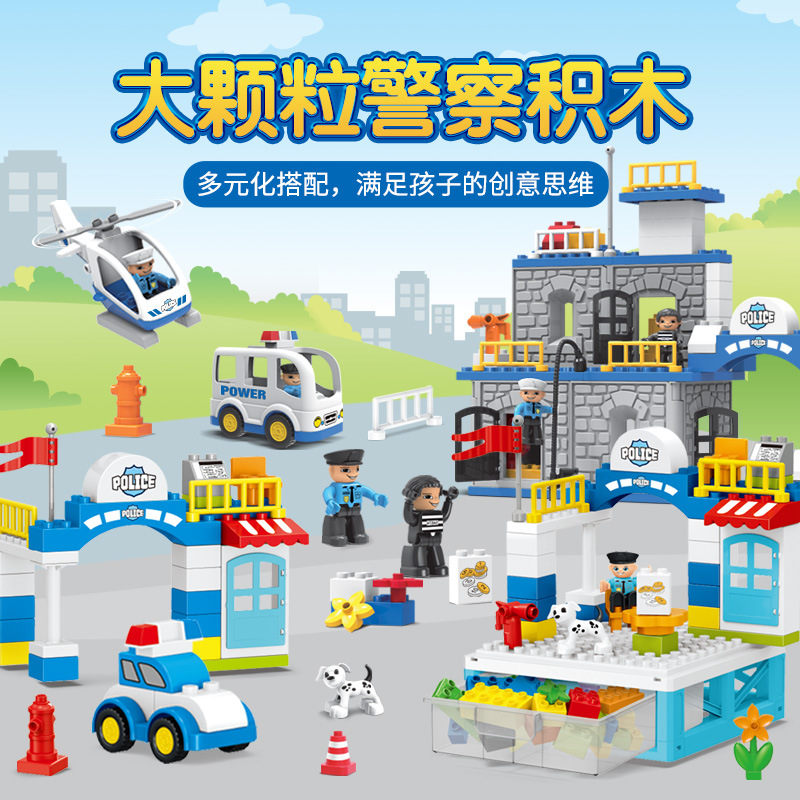 大きな粒子の都市警察は小さい車の列を守って積み木の子供の益智diy警察のシーンを組み立てておもちゃを挿し込みます。