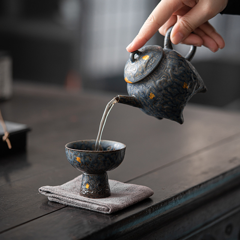 日本式の金の鉄の釉薬の手は壺の古早をつかんで復古の粗い陶器の蓋の陶磁器の工夫のティーポットのプーアルを焼いてお茶の碗を入れます。