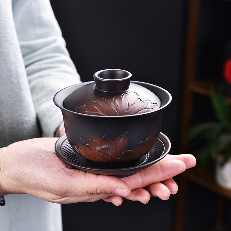 創意紫陶復古三才蓋碗手作り跳刀茶器蓋碗紫砂壺家庭用オフィスお茶茶碗