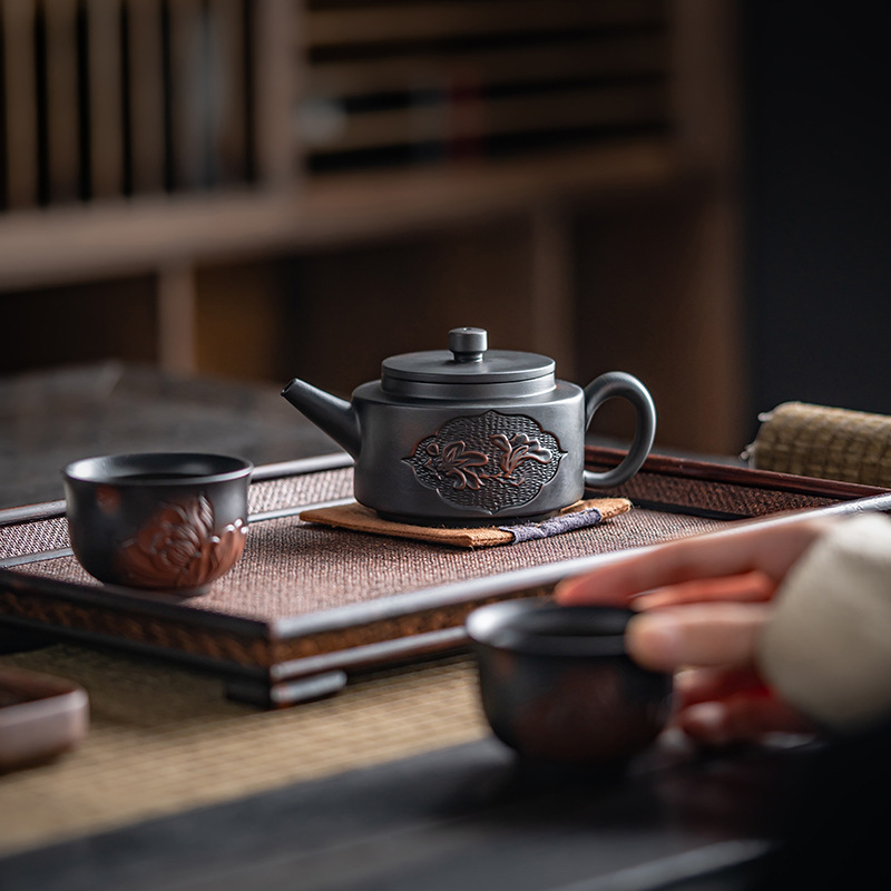 純粋な手作り彫刻紫陶壺工夫茶器家庭用オフィスティーポット浮き彫り紫砂セラミックスセット
