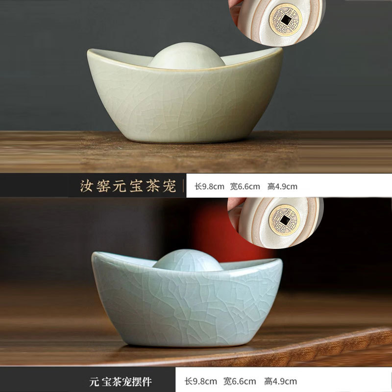 汝窯開片元宝置物デスクトップレトロ茶器陶磁器置物茶寵茶道茶遊び天青色茶置物