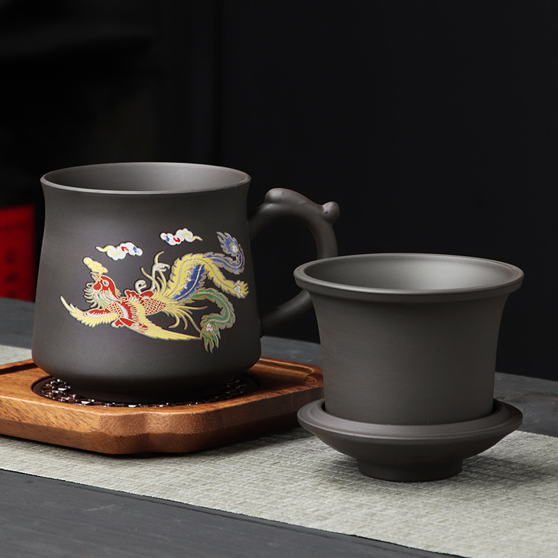 セラミック変色紫砂オフィス茶水分離大容量カップ家庭用オフィスマグカップ水カップ蓋付き