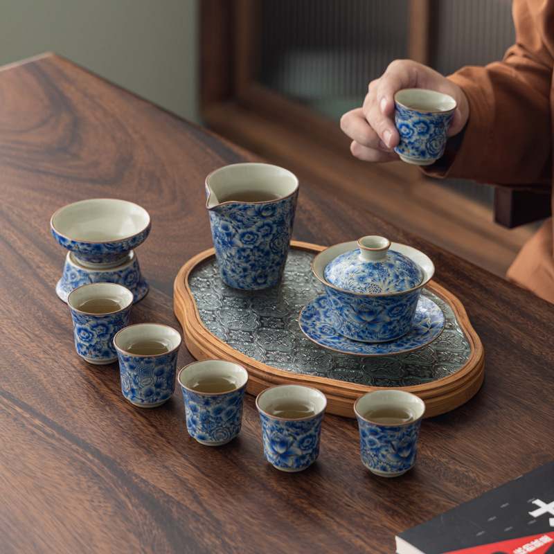 中国式汝窯青花開片は工夫茶器セットの家庭用オフィス陶磁器蓋碗茶杯にお茶を入れるセットです。