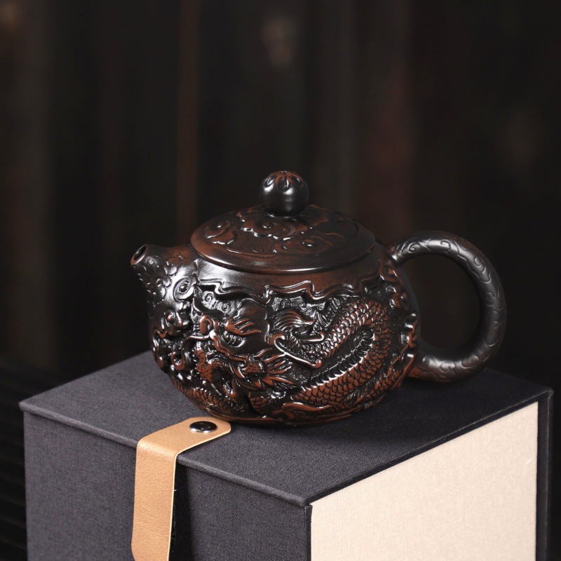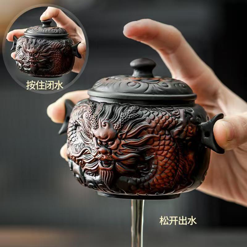 雲南紫陶純手工精工満雕祥龍漢瓦鳳鳴壺は回転可能な家庭用大容量ティーポットを持ち上げることができます。