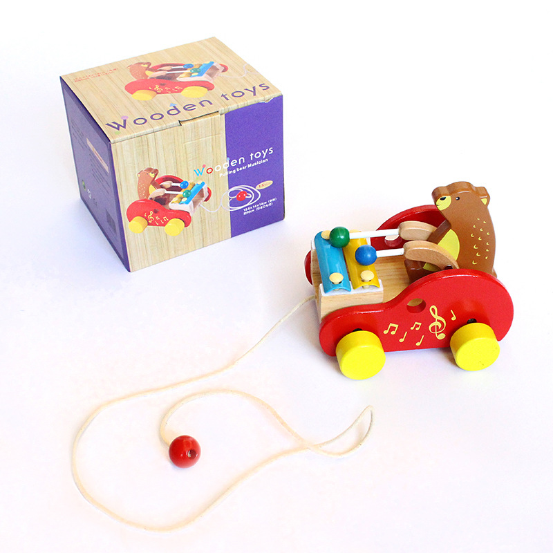 子供の熊が琴をたたいて車を引っ張って木の手を引いて線を引いて歩いている赤ちゃんのひものおもちゃの車は1歳です。