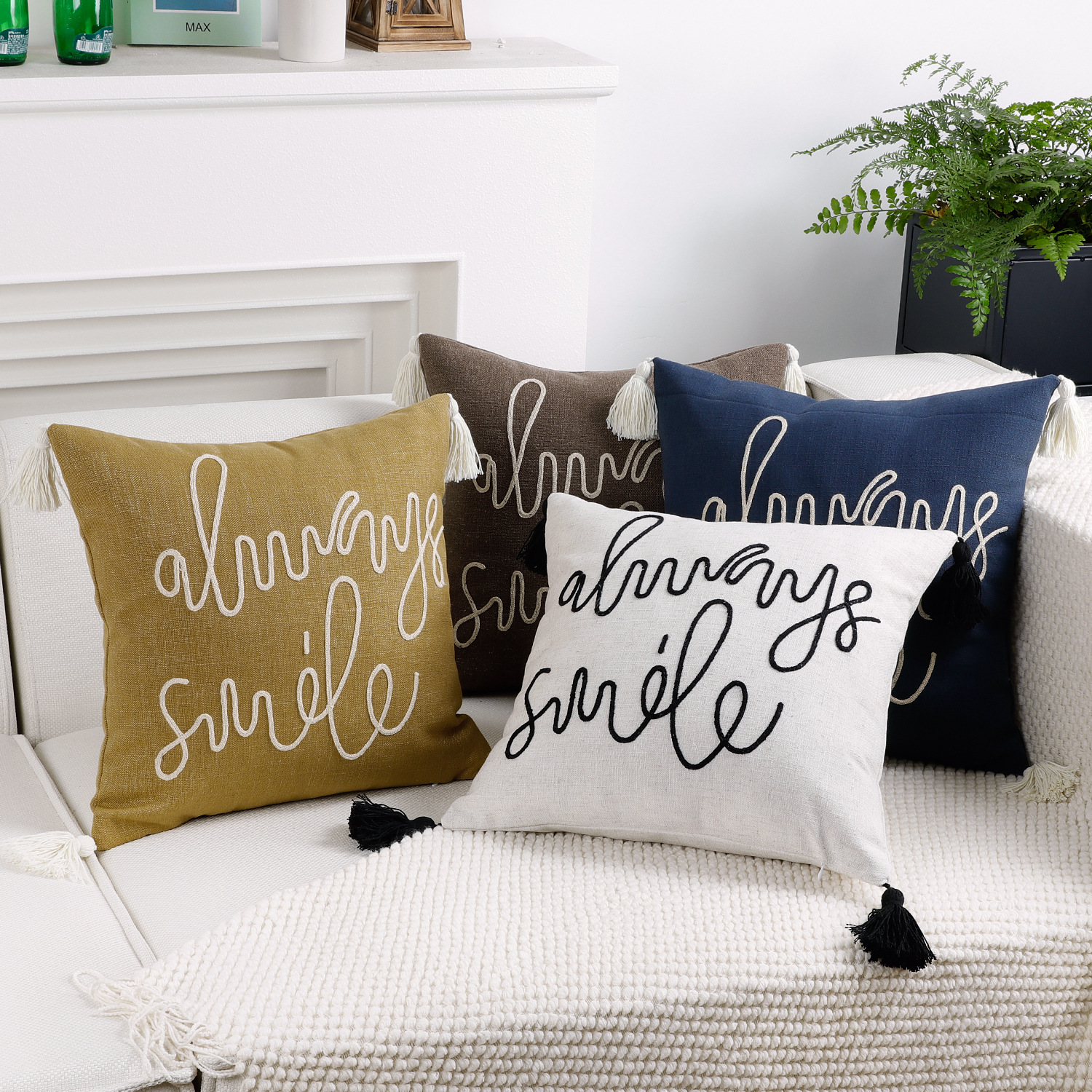Always Smile 英語刺繍クッションカバー 吊り下げタッセル装飾付き オールシーズン厚手のコットンとリネンの枕カバー