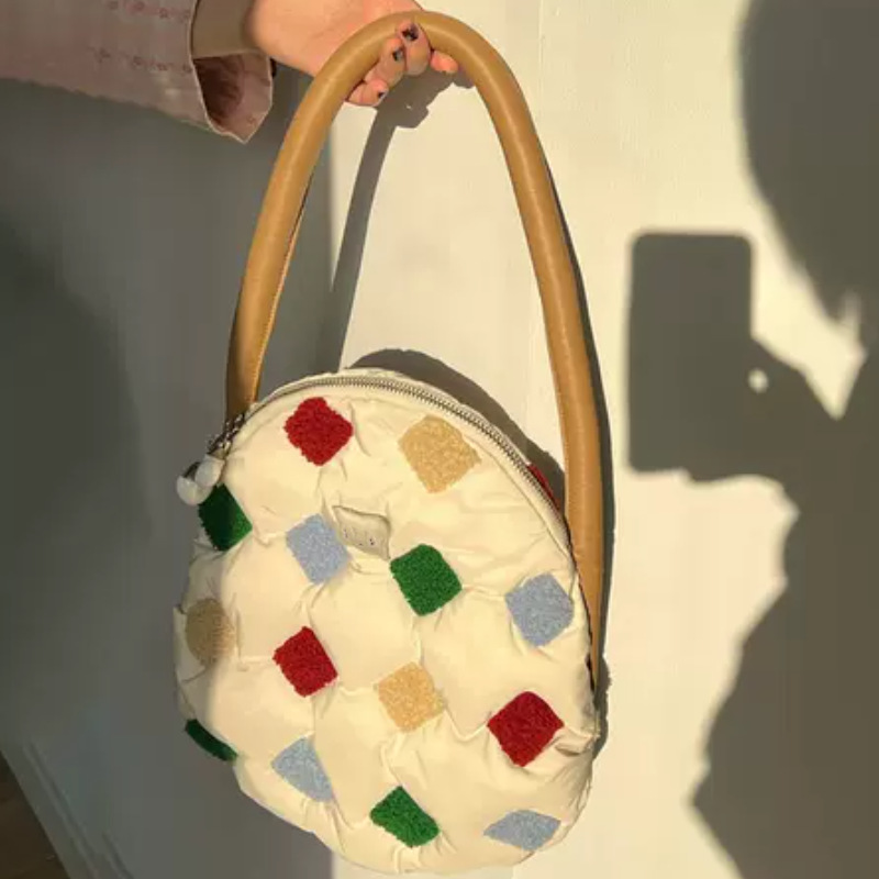 Ins小紅書小衆デザインパンパンバッグ綿刺繍筋理シングル肩ハンドバッグ波点色合わせ円盤バッグ