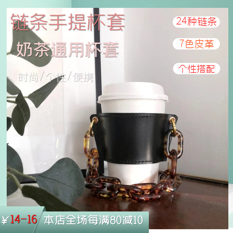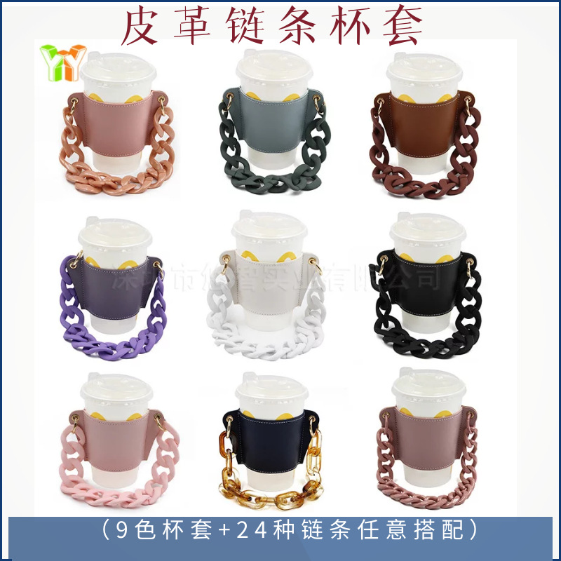 現物手持ち式真珠琥珀金属チェーンミルクティー通用革カップカバー多色チェーン個性コーディネート